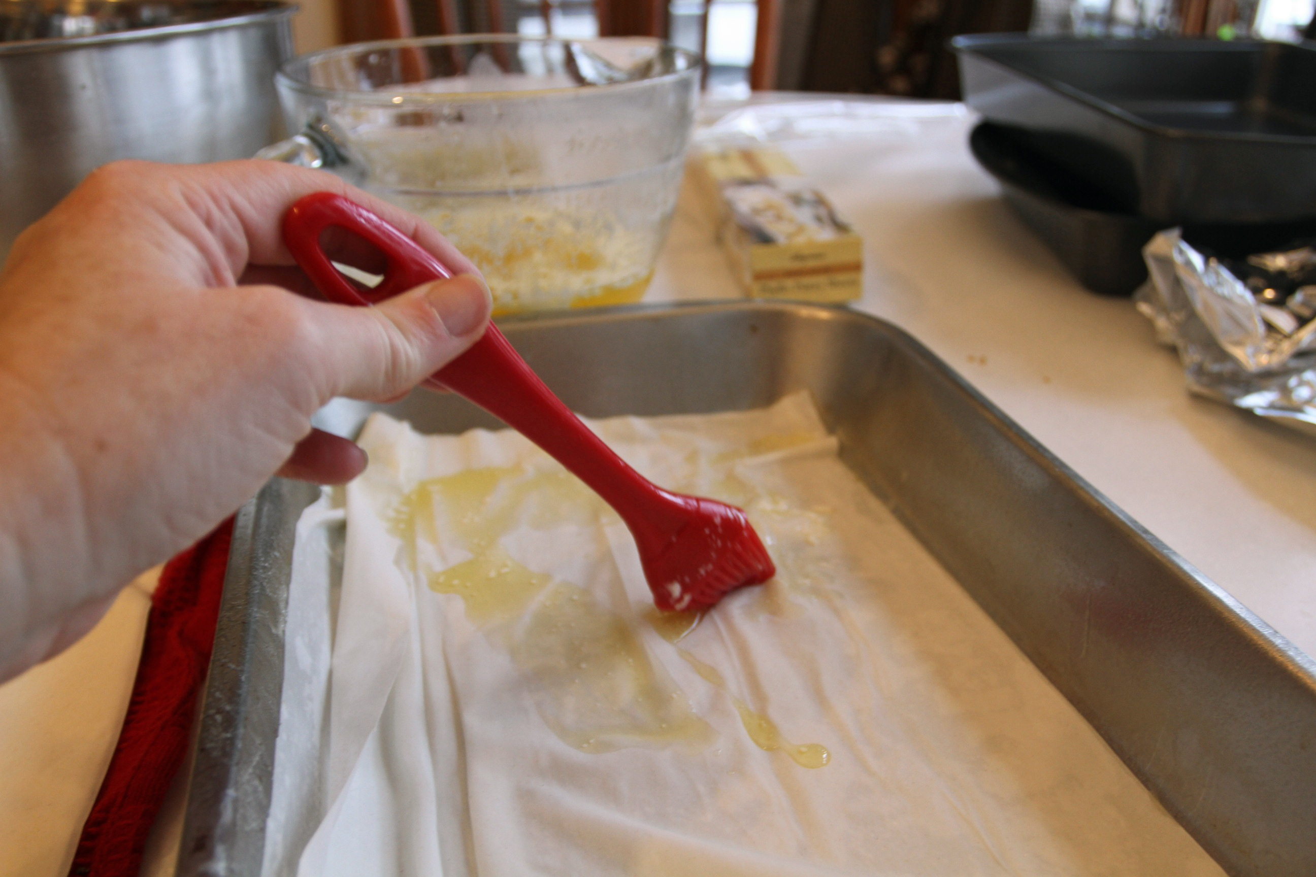Layer two sheets of phyllo dough in the bottom of the pan and brush melted butter over them using the pastry brush.