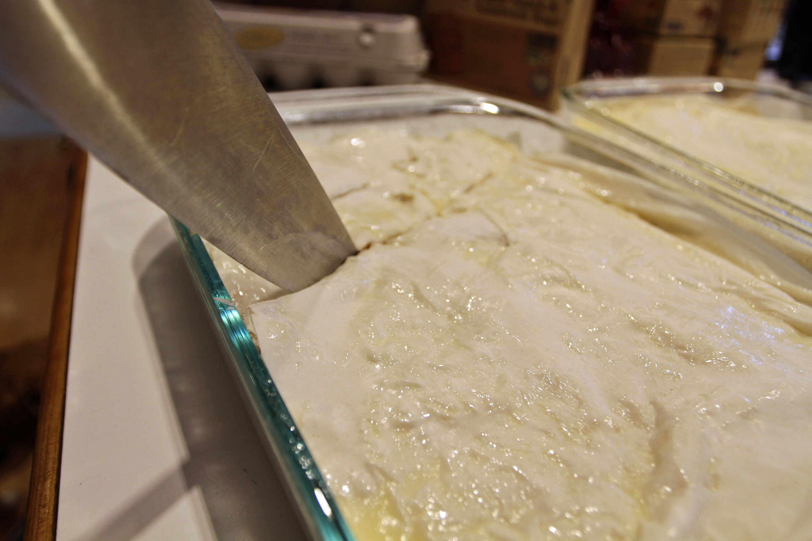 Next, use a knife to cut the uncooked baklava into diagonal pieces. You can make the pieces however big you want, but if you will be putting them into cupcake papers (as I sometimes do), make sure they are small enough to fit. Cut all the way through the bottom layer. This takes patience because the top layer will peel away sometimes. The more butter on the top layer, the less pulling away of that top layer of phyllo dough. Also, a spoon helps hold it down as you cut.