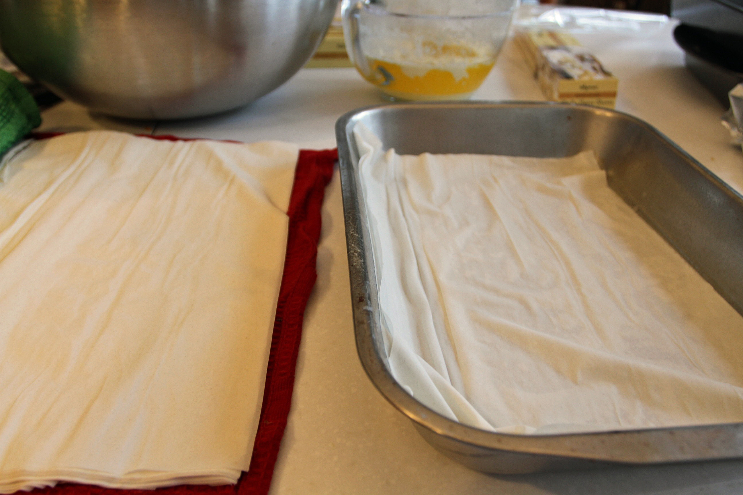 Place a damp towel on top of the phyllo dough sheets to keep them from drying out. Butter a 9×13 pan (I use both glass and metal).