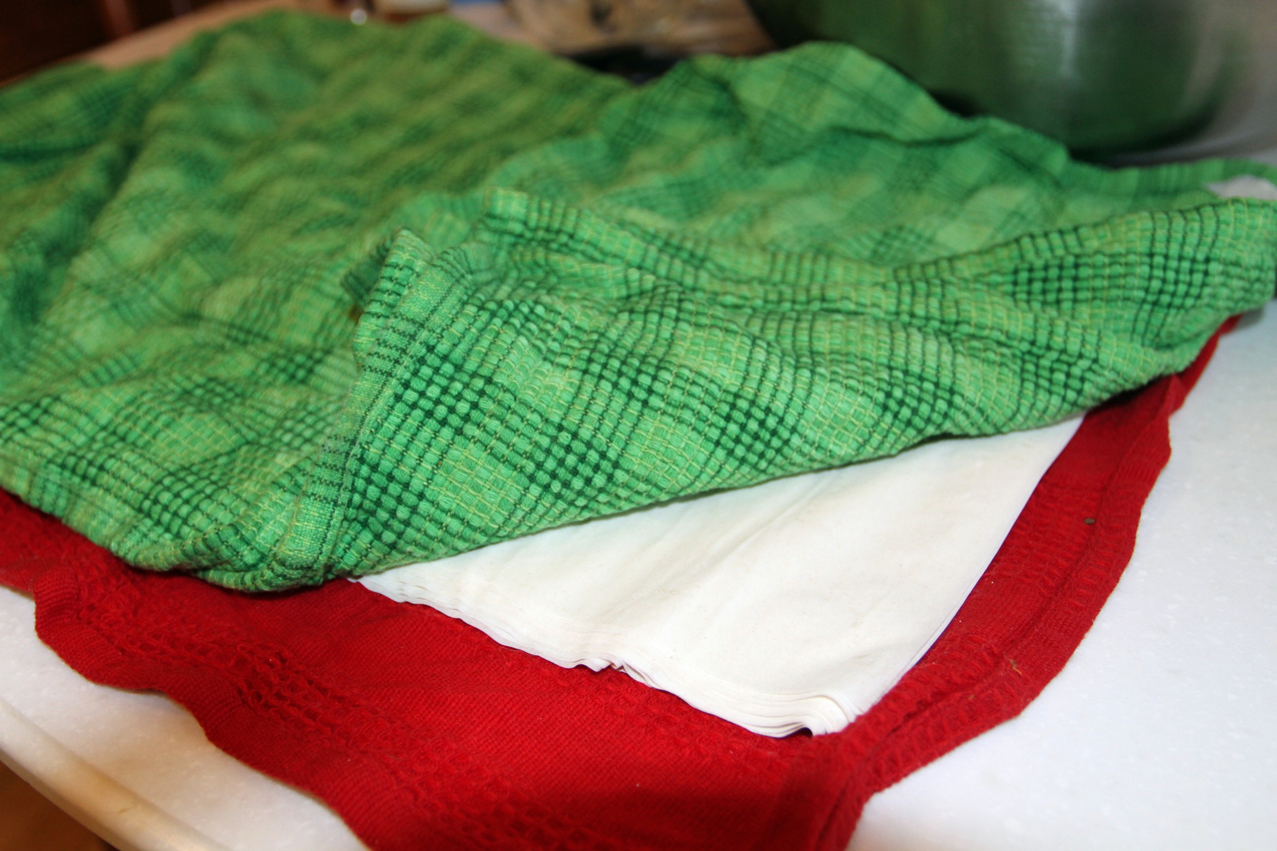 Put at least two damp kitchen towels on the kitchen table. Unwrap the first box of phyllo dough and place sheets on top of a damp towel. Use kitchen shears to cut the sheets in half so that you have two squares (not two long rectangles).