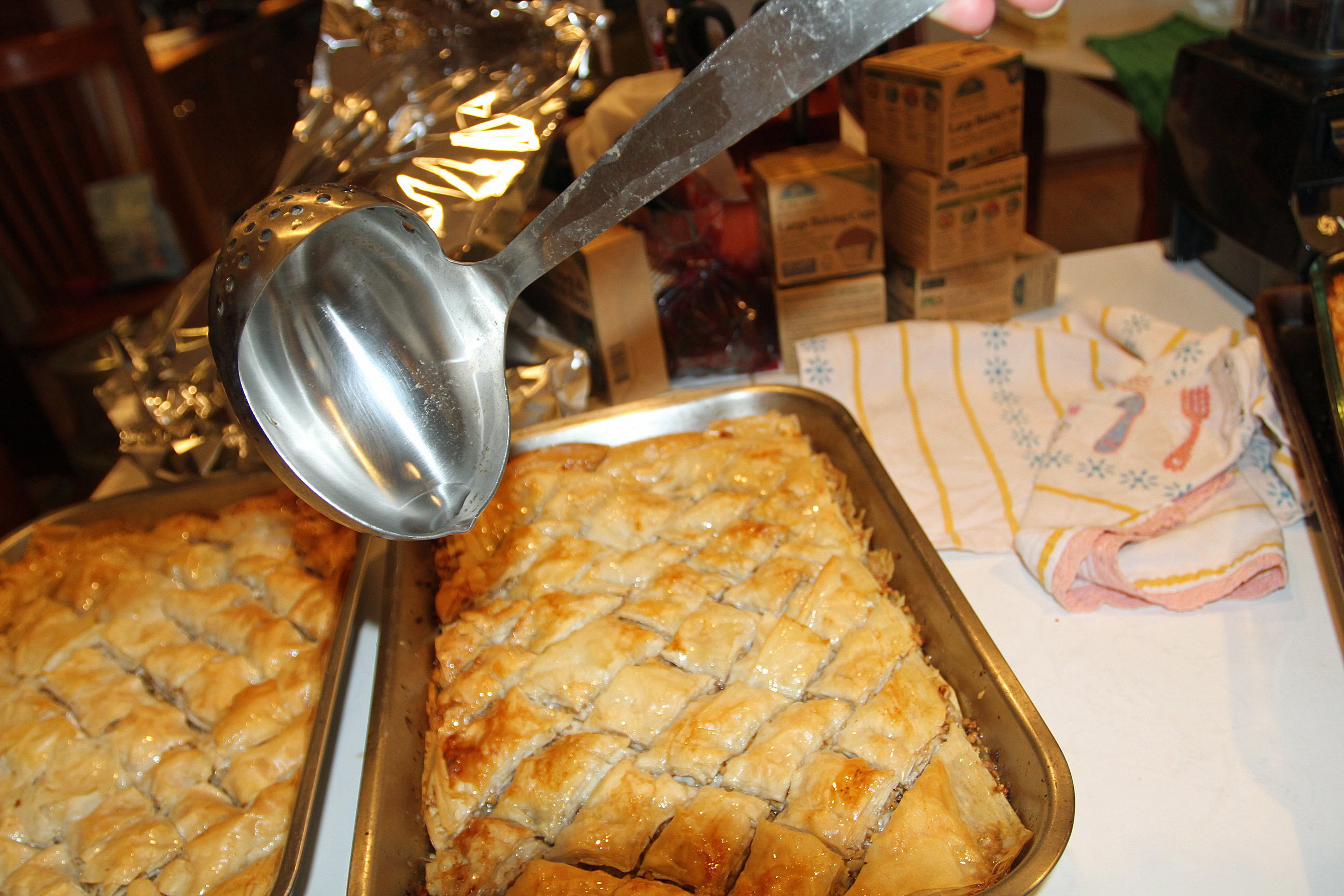 Every year we made an event out of the presentation of the baklava. Marge would talk about how hard it was and all those layers! The family oo’d and ahh’d and sympathized with all of her hard work and expressed our heart felt gratitude. Then we rolled our eyes in ecstasy at the taste of it. I actually didn’t even like it much when I was a kid (I liked her crescent cookies more), but the specialness of dessert and all the steps that were involved made it feel so Christmasy and I felt very loved that she would take that time for us. When I grew up, I came to love baklava for itself not just for the memories it evoked. Marge lived to be 95 but had stopped making baklava years before. I decided I would give it a try. I found out it is hard and there are a lot of steps, but in my busy life, I love that I take a whole day out to make one thing — no multi-tasking is possible with this one — a rarity in my life. And, it makes me feel like I’m doing something for Marge. I know she would love that I made the effort every Christmas in her honor.
